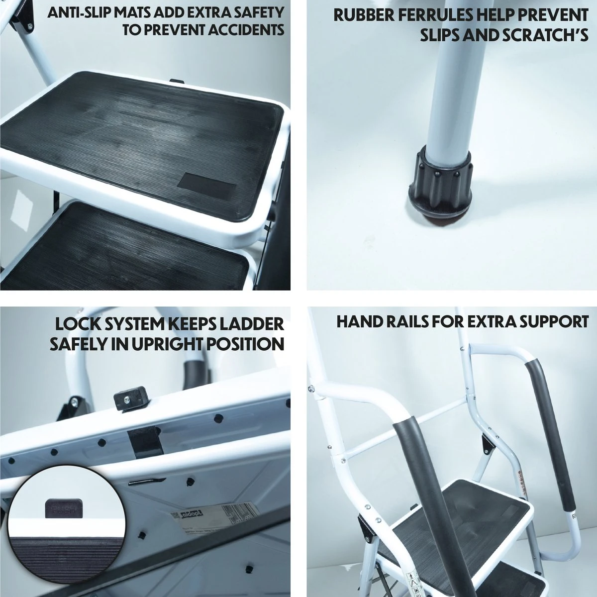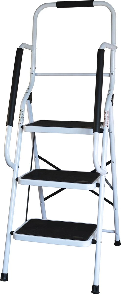 De opstapkruk met leuning is een veelzijdige opstap die zowel binnen als buiten kan worden gebruikt, ideaal voor schoonmaken, het uitvoeren van huisrenovaties, doe-het-zelf-klussen en het bereiken van moeilijk bereikbare plaatsen. Het opvouwbare ontwerp zorgt voor eenvoudige opslag en past op smalle plaatsen. Het lichtgewicht en dichte ontwerp zorgen voor gemakkelijk vervoer tijdens het gebruik. Deze trapladder heeft een veilig en stevig ontwerp. De antislip brede pedalen geven gebruikers een evenwichtig gevoel, en de rubberen hulzen beschermen uw vloer tegen krassen en verminderen de kans op uitglijden. De rubberen leuning zorgt voor extra grip. Verkrijgbaar als 2 of 3 treden model.