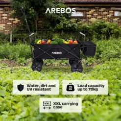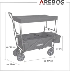 [FUN] De duurzame nylon stof en stevige frameconstructie bieden een maximaal draagvermogen tot 70 kg. De AREBOSBollerwagen biedt dus voldoende ruimte voor uitstapjes met de kinderen, festivals of andere vrijetijdsactiviteiten.