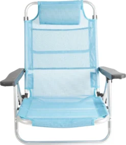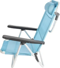 Lage en compact opvouwbare strandstoel. Deze stoel is verstelbaar in 5 standen waarvan 1 stand volledig plat kan. Hierbij steunt de boog aan de achterkant van het hoofdeinde voor ondersteuning op de grond. Deze boog kan ingeklapt worden zodat de stoel extra plat opvouwbaar is. Het frame is gemaakt van lichtgewicht aluminium en de bekleding van Textileen. Daarnaast is deze strandstoel voorzien van comfortabele armleuningen, stabilisatoren, een vakje om tijdschriften in op te bergen en een hoofdkussen dat naar achter is weg te klappen.