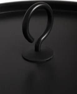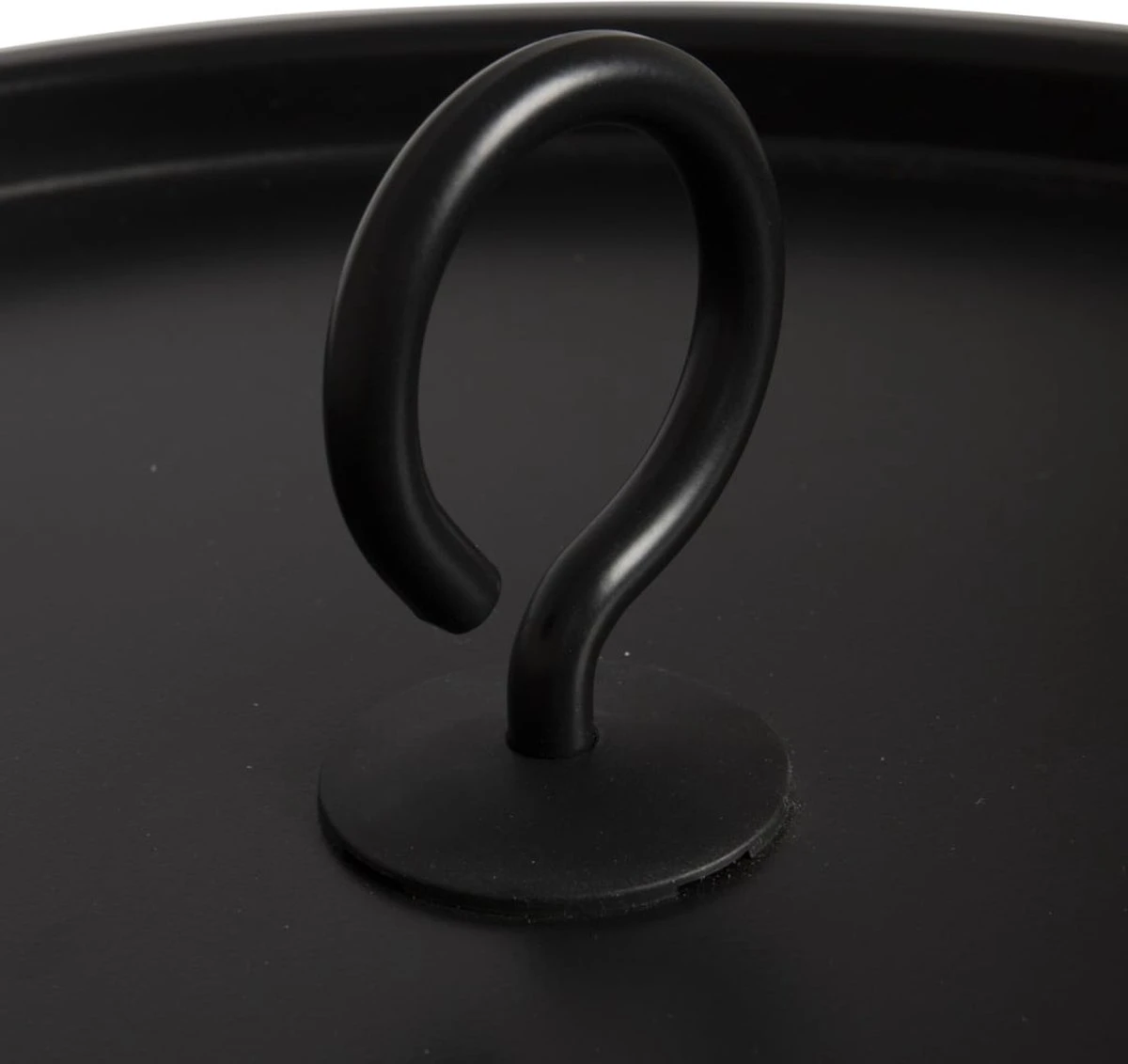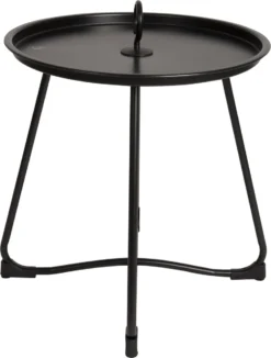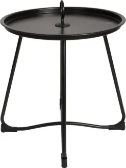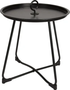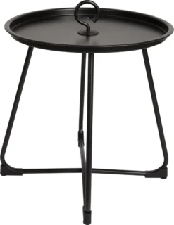 Kleur: zwart Materiaal: staal Afmetingen: 45 x 44 cm (ø x H) Trendy campingtafel Kan zowel binnen als buiten gebruikt worden Afneembaar blad Inklapbare poten Afneembaar massief handvat Stevige constructie Gewicht: 1,7 kg