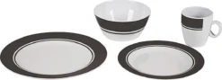 Een 16-delig servies van 100% melamine. Melamine servies is vrijwel onbreekbaar en zeer licht van gewicht. Daarnaast is het servies kraswerend en vaatwasmachinebestendig. Deze stijlvolle set is geschikt voor 4 personen en bestaat uit 4 borden, 4 ontbijtbordjes, 4 kommen en 4 mokken.