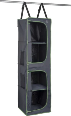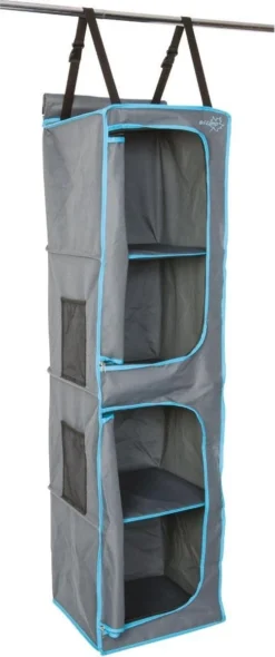Een opvouwbare 4-vaks hangkast. Beschikt over 4 ruime vakken welke afgesloten kunnen worden met de oprolbare deurtjes. Eenvoudig en op diverse manieren te bevestigen. Zo kan deze organizer met de pees worden opgehangen aan een caravanrails, met het klittenband of met straps aan een tentstok of met de zeilogen aan haken. De lussen onderaan zorgen voor extra fixatie. Gemaakt van extra stevig 600D Two Tone polyester.