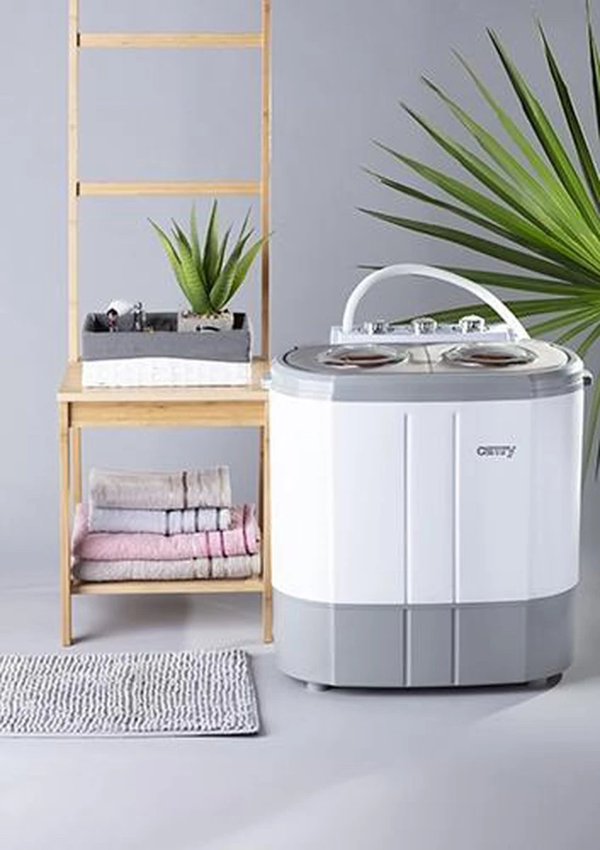 De Camry Premium CR8052 wasmachine, met een aparte centrifuge trommel naast de was trommel, is ideaal voor kleine wasjes op de camping of op vakantie! Deze machine is eenvoudig in gebruik en heeft een compact formaat.