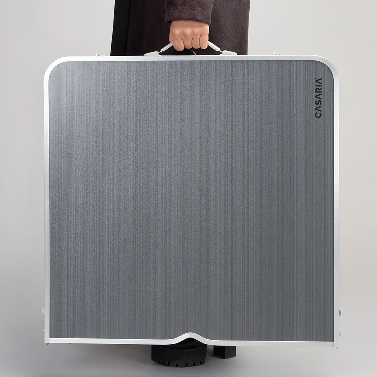 Bijzonder is de ruimtebesparende vouwfunctie. Dankzij de draaggreep, het lage gewicht en de vouwfunctie is de tafel gemakkelijk te vervoeren en past hij in bijna elke kofferbak.