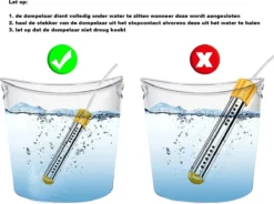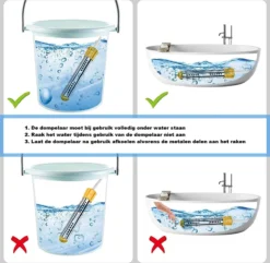 De dompelaar moet voor veilig gebruik volledig in water worden ondergedompeld. Voordat u het water aanraakt, trekt u eerst de stekker uit het stopcontact en vervolgens de boiler! Gebruik het niet langer dan 3 uur aaneengesloten! Als de capaciteit van uw emmer, badkuip of klein zwembad groot is en er meer dan 2 boilers nodig zijn om tegelijkertijd te verwarmen, sluit dan de twee dompelaars niet op hetzelfde stopcontact aan om brandgevaar te voorkomen.