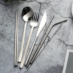 House Of Husk Reisbestek – Reis Bestekset – Chopsticks – Metalen Rietjes Met Borstel – Lepel – Vaatwasserbestendig – RVS – 7 Delig – Zilver