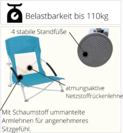 - ADEMEND MATERIAAL: Deze vouwstoel is voorzien van gaasstof, zodat je lekker droog zit, ook bij erg warm weer. Uitgevouwen meet dit zitvlak 60 x 65 x 64 cm met een maximale capaciteit van 110 kg.