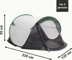- TWEEPERSOONS: Deze tent is geschikt voor 2 personen. De afmetingen van de tent bedragen 220 x 120 x 95 cm. Bij gebruik van matjes met een lengte van 200 cm, houd je aan het voeteneind ruimte over voor spullen en bagage.
