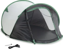 - POP UP & GO: Pop-up tent, opgooitent of werptent zijn verschillende benamingen voor dit handige tentje. Je haalt hem uit de hoes en hij klapt vanzelf uit elkaar. Paar haringen in de grond, paar scheerlijnen en je bent klaar om te gaan!