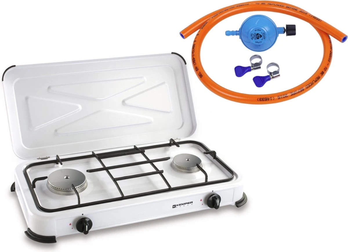 Kemper Gas Kooktoestel – Campingkooktoestel – INCLUSIEF Installatiesetje – Met 2 RVS Branders – 2600W