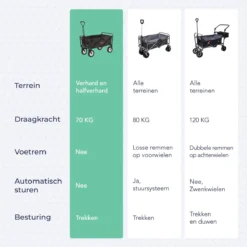 De opvouwbare bolderkar is ook multifunctioneel. Gebruik je de kar bijvoorbeeld op de camping of in de tuin? Deze bolderkar bevat 2 bekerhouders waardoor jij je koffie altijd bij de hand hebt, waar je ook naartoe gaat. De wielen zijn 360 graden draaibaar en is daardoor super flexibel. De kar zal daarom geen rare bewegingen maken als je een bocht maakt en soepel met je meerijden. De bolderkar kan een gewicht van 70 kilo aan, waardoor je niet bang hoeft te zijn voor het vervoeren van zware spullen. Het eenvoudige en slimme ontwerp maakt de kar multifunctioneel en ideaal voor een heleboel gelegenheden.