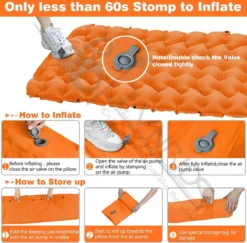 - Slechts 60 seconden stomp to opblazen: druk op het luchtbed op de camping met de hand of op de voet. Niet meer met de mond, de handen opblazen of een pomp dragen, druk gewoon op de ingebouwde luchtpomp aan de onderkant van de zelfopblazende isomat om hem in minder dan 60 seconden op te blazen.