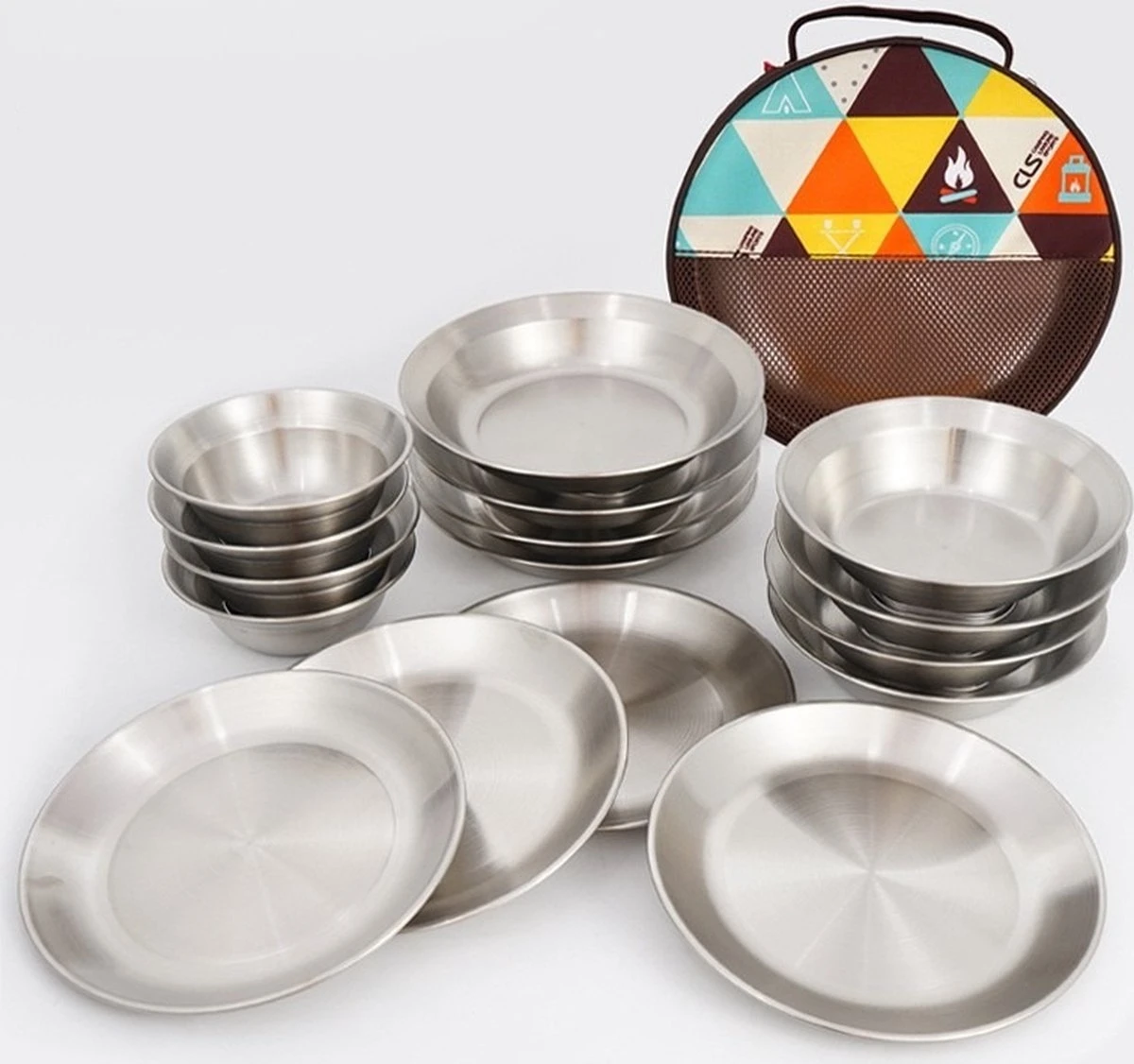 Merkloos Kampeerservies Roestvrijstaal Borden En Kommen 16-delig Servies RVS