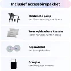 - Inclusief accessoires (Elektrische pomp, kussens, tas en reparatiekit)