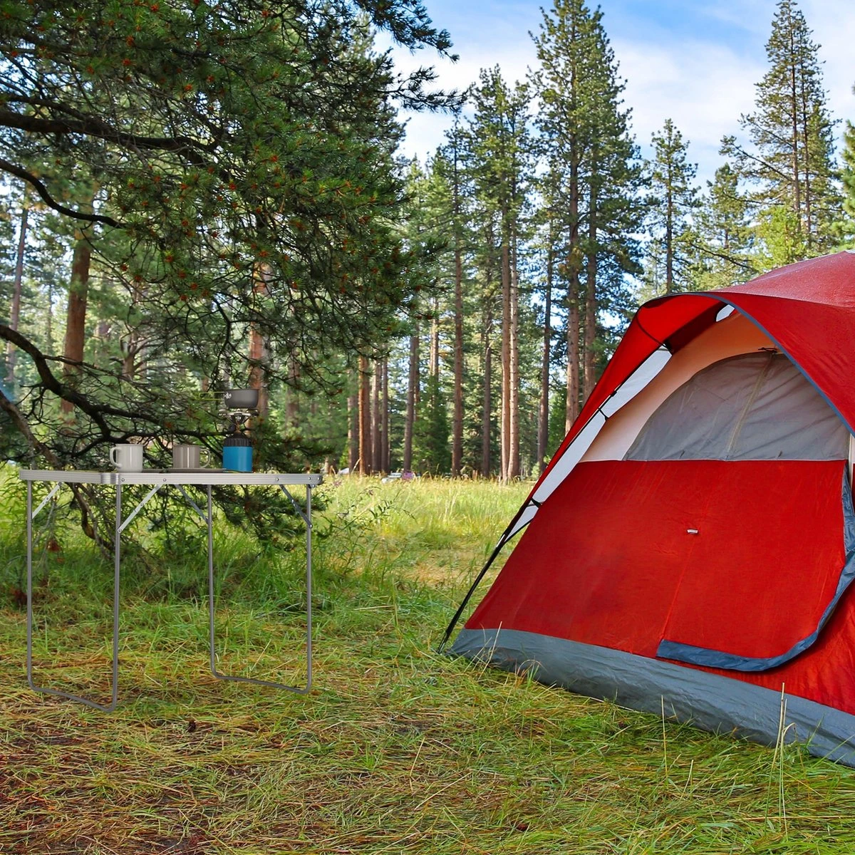 De inklapbare campingtafel heeft veel voordelen die jouw outdoor-verblijf nog aangenamer zullen maken. De tafel is licht en kan zonder gereedschap binnen handomdraai opgebouwd worden. Opgevouwen neemt de klaptafel weinig ruimte in beslag, kan ruimtebesparend in de kofferbak opgeborgen worden en kan dankzij de grepen goed van A naar B gedragen worden. Het aluminium frame zorgt ervoor dat de klaptafel stevig staat, waaraan tot 4 personen ontspannen kunnen eten.