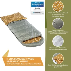 Skandika Dundee Flannel-R Slaapzak – Slaapzakken – Slaapzakken Volwassen – Maat M – Unisex – Katoen, Luxe Kwaliteit, Dubbele Slaapzak, 3 Seizoenen, Tot -20°C – 220 X 80 Cm – Outdoor Kampeerslaapzak – Ritssluiting Rechts – Grijs/geel