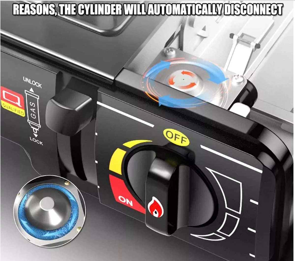 GEMAKKELIJK TE GEBRUIKEN: Het draagbare gasfornuis is gemakkelijk te gebruiken en schoon te gebruiken. Ga als volgt te werk: 1. Plaats het patroon> 2. Open de schuifregelaar> 3. Draai de thermostaat zo ver mogelijk> 4. en de kachel is klaar om te koken of te grillen.