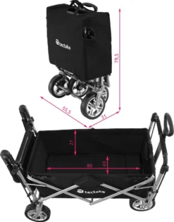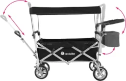 Vele opbergmogelijkheden en een verwijderbaar dak zijn slechts enkele van vele highlights van deze functionele handkar van tectake. Door het doordachte plooimechanisme is de transportwagen in een handomdraai startklaar. De uittrekbare dissel, de verstelbare schuifgreep alsook de lichtlopende kunststofwielen met profiel maken het rijden en sturen comfortabel en krachtbesparend. Het solide frame en het duurzame polyesterweefsel garanderen een grote belastbaarheid, een hoge ongevoeligheid tegen water en bui alsook een lange levensduur – voor vele toepassingen op belevenisvolle familie-uitstappen of spannende festivals.
