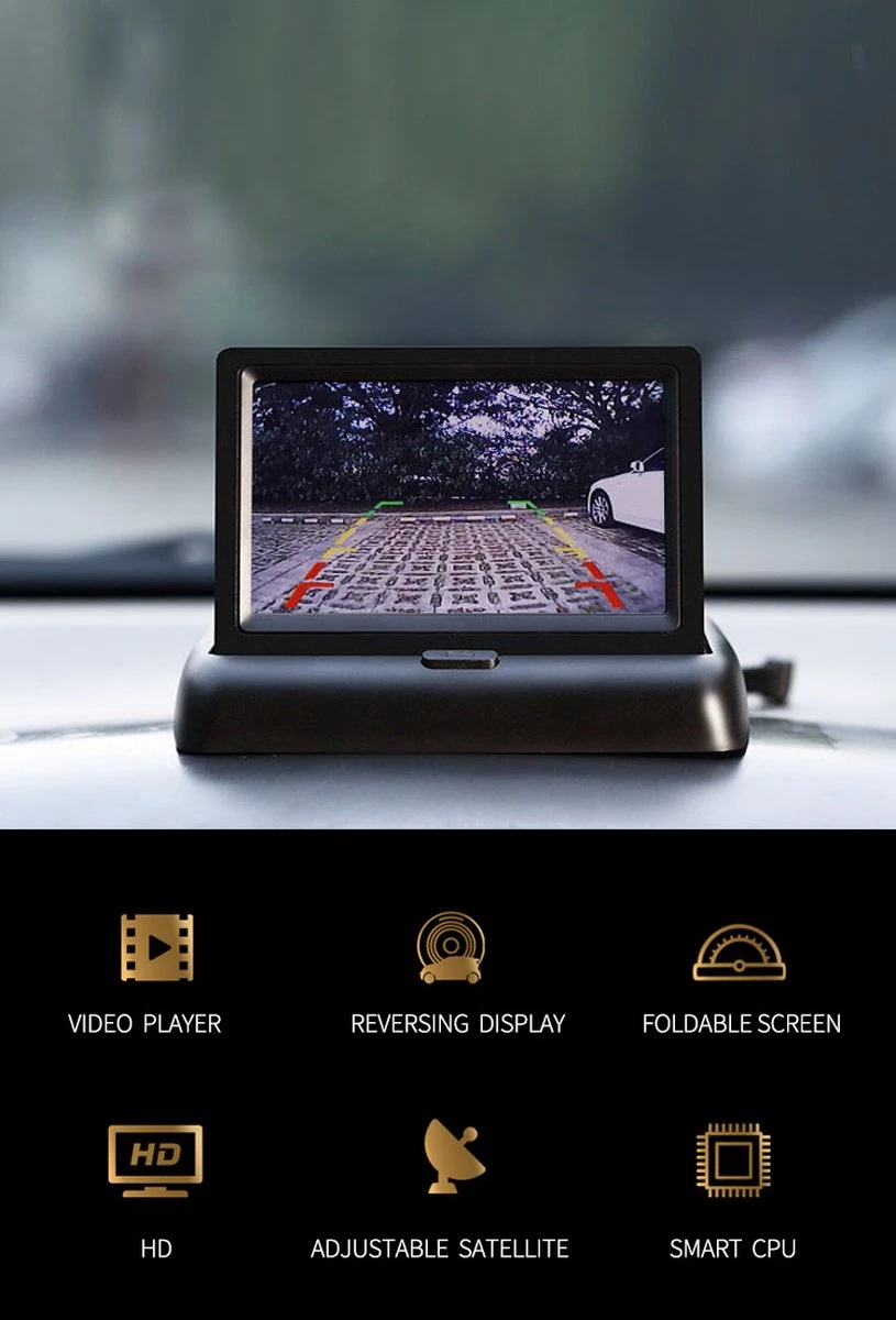 De draagbare monitor 4.3 inch kan eenvoudig op je dashboard geplaatst worden. De vouwbare display Helpt bij het voorkomen van ongelukken tijdens het achteruit rijden met aansluiting op een achteruitrijcamera. Ook is de 4.3 inch color monitor geschikt voor DVD speler,TV en A/V Input toestellen. Wordt geleverd met stroom- en videokabels